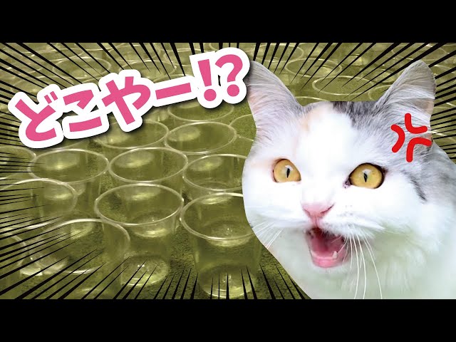 大量のコップに隠されたちゅーるを探す猫【おしゃべりする猫】