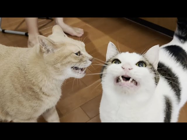 目の前で口を大きく開けてニャーとおねだりする猫